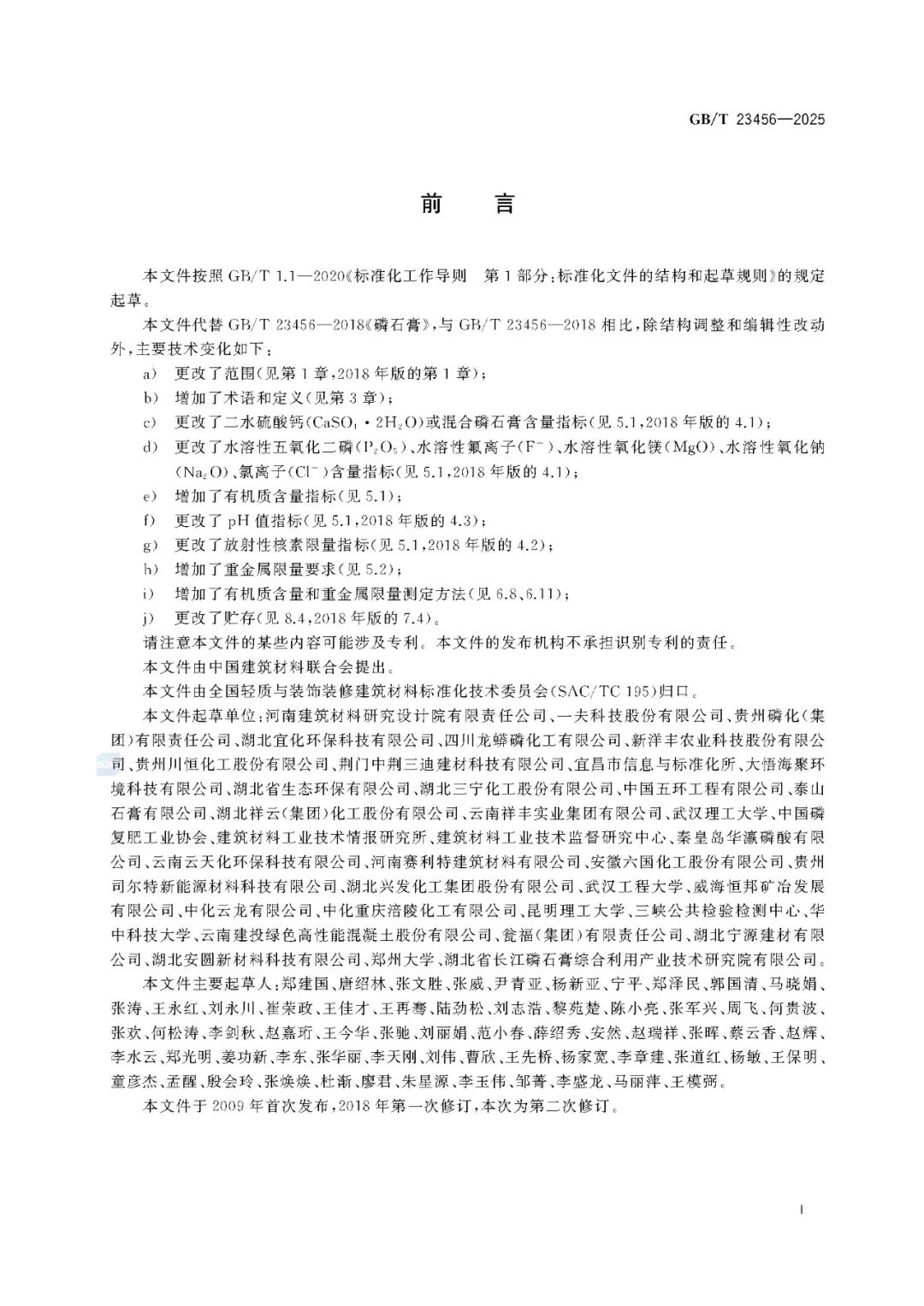 本标准代替GB/T 23456一2018《磷石膏》。与GB/T 23456一2018相比,除结构调整和编辑性改动外,主要技术变化如下: